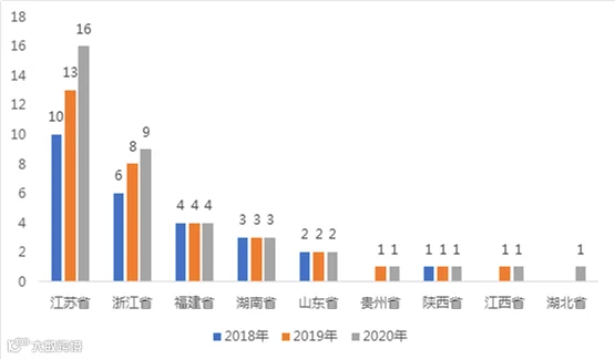 2018-2020年中国各省“千亿县”数量变化