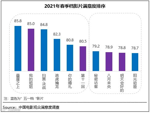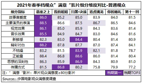 中国电影观众满意度调查・2021年春季档调查结果显示,春季档观众满意度得分83.1分,为2015年开始调查以来同档期最高分,较2019年同期上涨1.6分。其中“五一”期间上映的谍战片《悬崖之上》以85.8分夺得档期满意度冠军,清明假期上映的亲情片《我的姐姐》以85.0分居档期第二位,4月21日压哨定档“五一”的犯罪剧情片《扫黑·决战》满意度84.8分居档期第三位。