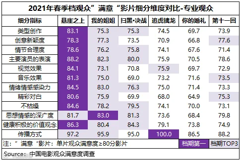 《悬崖之上》、《我的姐姐》和《扫黑·决战》为档期满意度前三甲,在包揽档期影片观赏性、思想性和传播度前三位的同时,三部影片各领得一项指数头牌。张艺谋导演的《悬崖之上》打破了国产谍战片多年的沉寂,满意度85.8分,观赏性85.7分为档期最高;《我的姐姐》是青年演员张子枫首次担当主演的影片,通过两代“姐姐”的故事折射社会现实,引发了观众的共鸣,传播度以84.6分居首;《扫黑·决战》为国内首部写真式展现全国扫黑除恶斗争的故事片,既直击社会痛点,又彰显国家行动之坚决有力,以87.5分获思想性之首。
