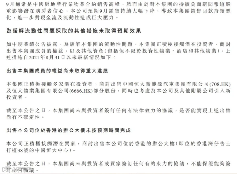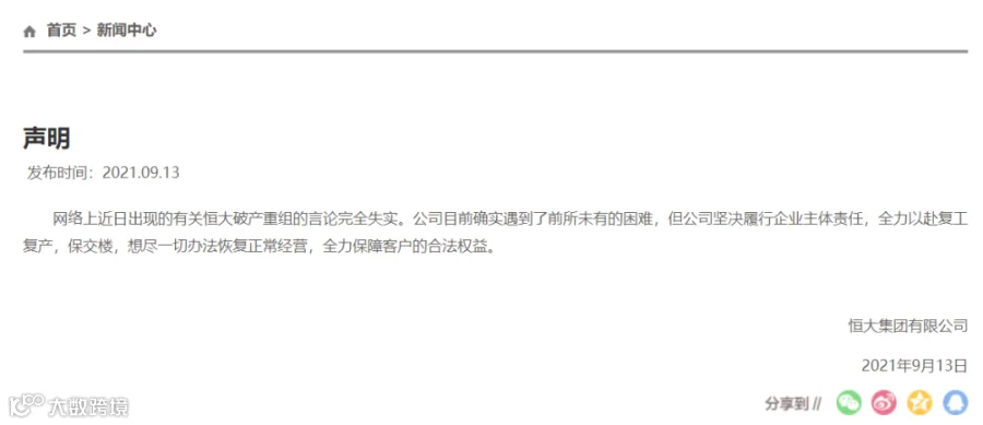 2021年9月13日,恒大集团发表声明称,网络上近日出现的有关恒大破产重组的言论完全失实。公司目前确实遇到了前所未有的困难,但公司坚决履行企业主体责任,全力以赴复工复产,保交楼,想尽一切办法恢复正常经营,全力保障客户的合法权益。