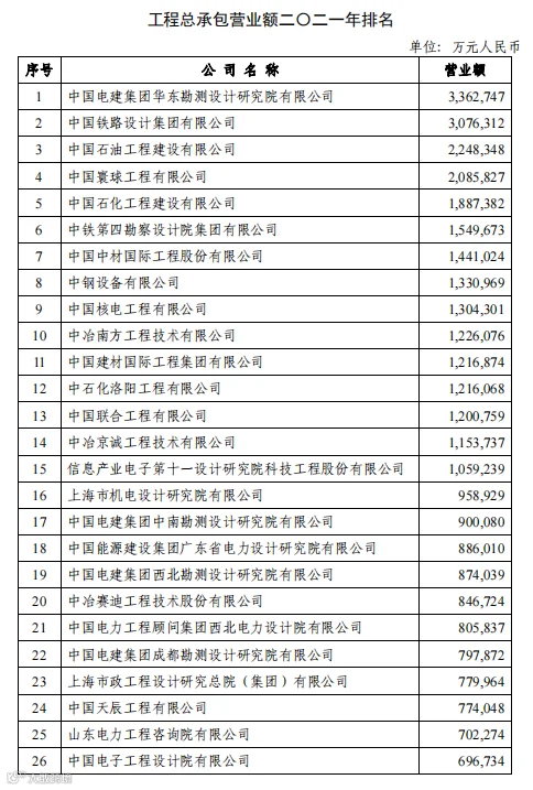 排名第一的中国电建集团华东勘测设计研究院有限公司,营业额达到336亿元。相比2020年位于榜首的中国铁路设计集团有限公司237.89亿足足多出了100亿元!