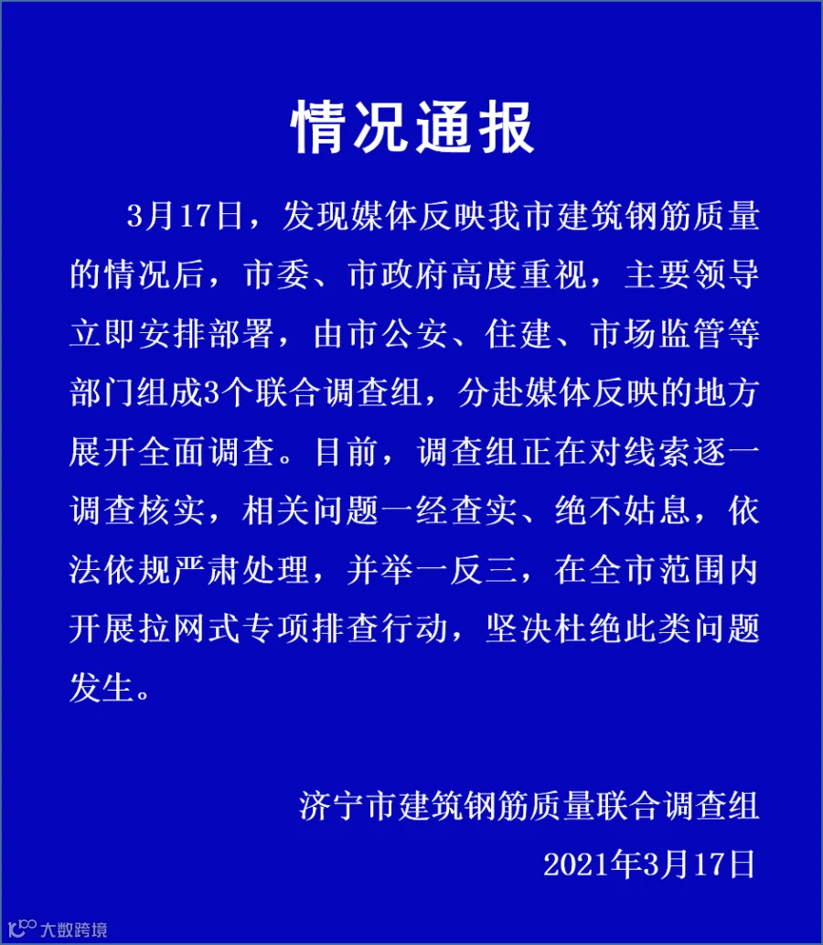 3月17日,济宁市建筑钢筋质量联合调查组回应称,目前,调查组正在对线索逐一调查核实,相关问题一经查实、绝不姑息,依法依规严肃处理,并举一反三,在全市范围内开展拉网式专项排查行动,坚决杜绝此类问题发生。