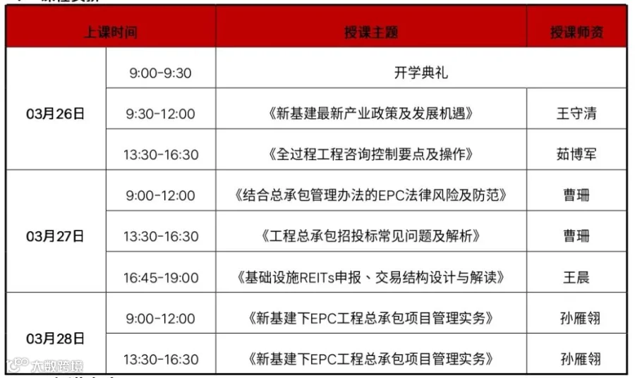 各位同学,您好!《新基建下EPC工程总承包与全过程工程咨询实战型高级研讨班 第57期》,定于2021年03月26日-28日开课。请您合理安排时间,提前联络教务老师,按时上课。
