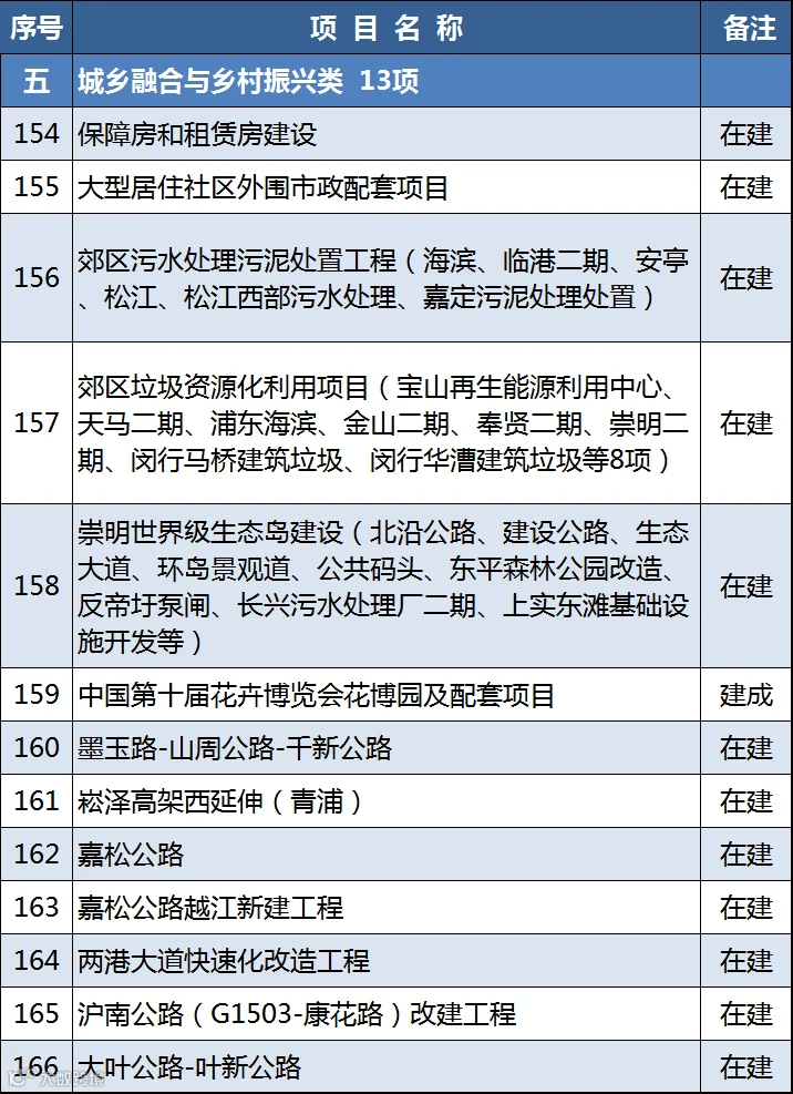 计划新开工6项:奉贤海上风电项目、沪杭客专上海南联络线、轨道交通13号线西延伸(金运路站-诸光路站)、漕宝路快速化改造工程、杨高路改建工程、浦星公路(南行港路-人民塘路)改建工程。