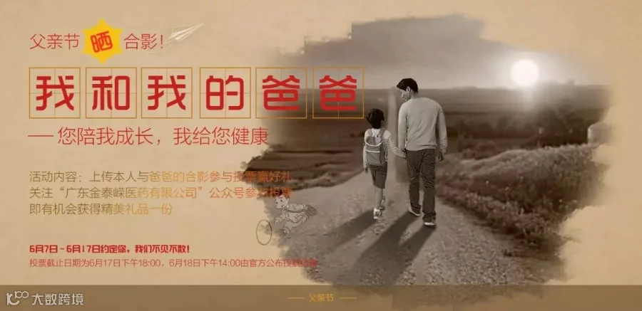由广东金嵘医药有限公司作为主办方,由广州华嵘健康科技有限公司总策划及联合主办的“父亲节晒合影赢好礼”活动将于2017年6月7日正式上线,本次活动采用投票方式,参与人员上传本人与父亲的合影作品,即时发起投票与拉票!投票时长为11天,只要努力的伙伴们必定能为父亲赢取丰富的健康好礼!