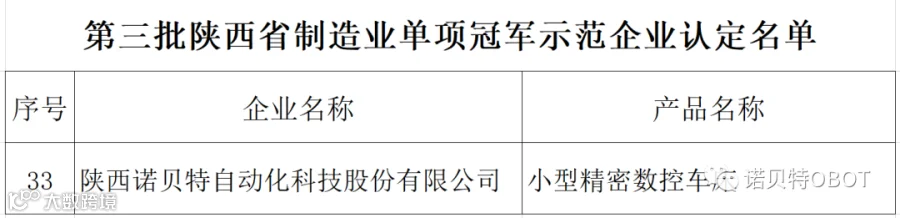 近日,陕西省工业和信息化厅公布了“第三批陕西省制造业单项冠军示范企业认定名单”,诺贝特凭借对核心产品的长期坚守、持续的创新能力和卓越的品牌影响力,成功入选。