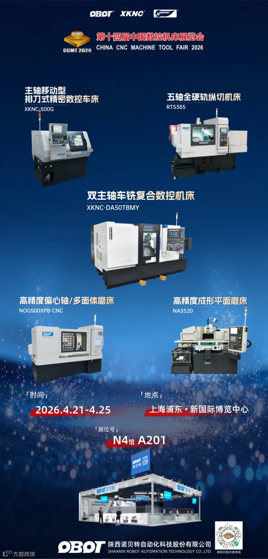 陕西诺贝特将携XKNC、OBOT、NAGASHIMA三大品牌重磅参展,带来5款核心机型,涵盖排刀、纵切、自动化、磨床等全系列产品。依托自主研发的硬核技术、全流程自动化解决方案与多年行业深耕经验,诺贝特以高精度、高稳定性的设备,为制造业智能化升级赋能。
