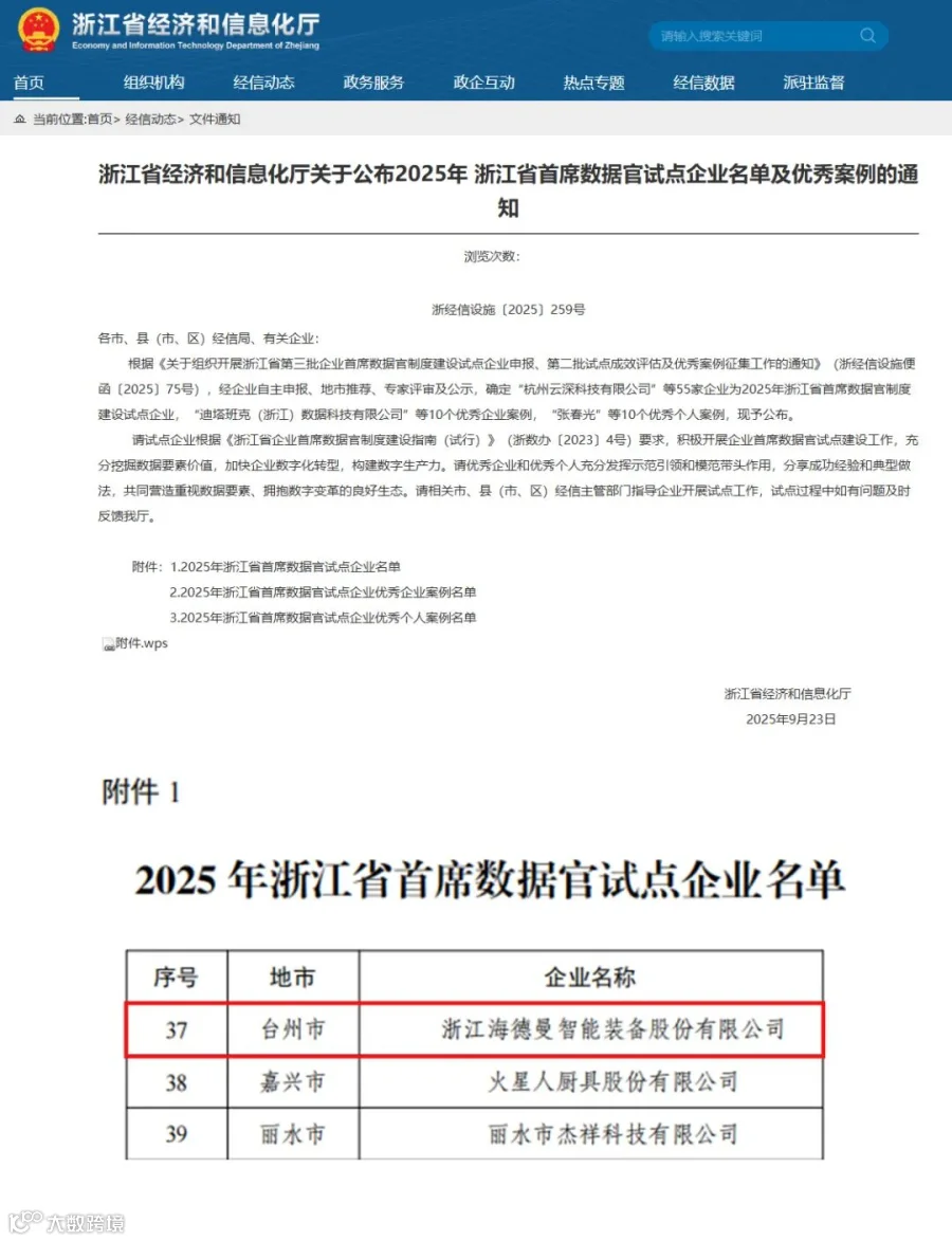近日,浙江省经济和信息化厅公布了2025年浙江省首席数据官试点企业名单,经过严格评审,浙江海德曼智能装备股份有限公司凭借在数据要素应用、数字化转型领域的前瞻布局与显著成效,成功入选。