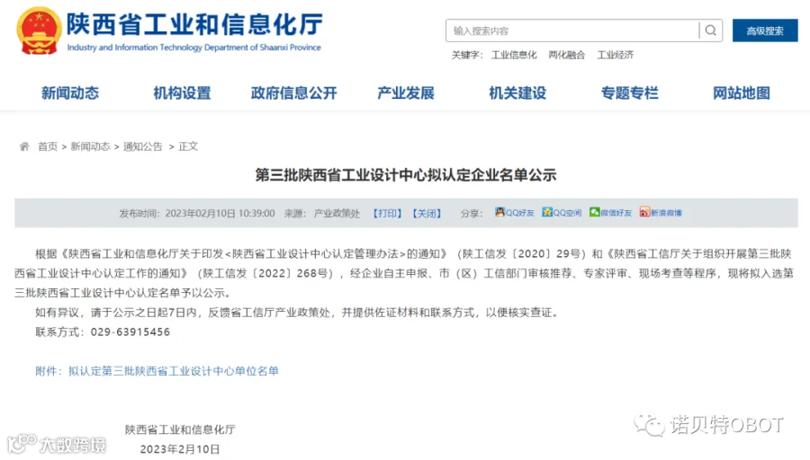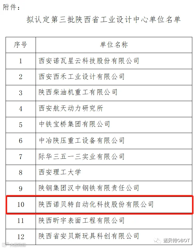 近日,陕西省工业和信息化厅发布了“第三批陕西省工业设计中心拟认定名单公示”,陕西诺贝特自动化科技股份有限公司榜上有名。