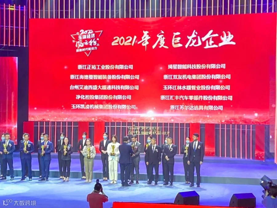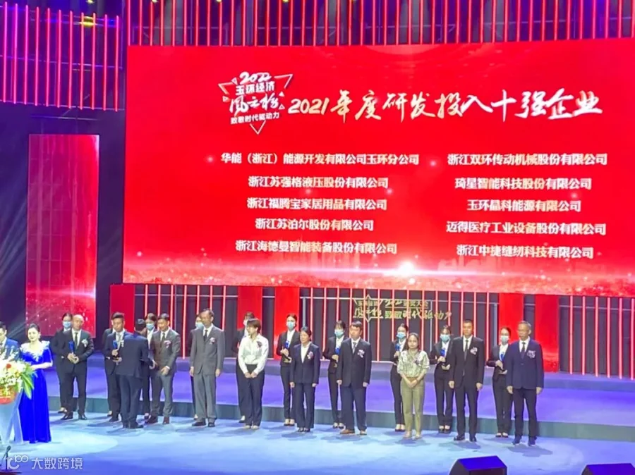 2022年5月7日上午,首届玉环经济风云榜颁奖大会在玉环大剧院隆重举行。大会发布了2021年度风云企业家、2021年度巨龙企业、玉龙企业前十强,以及2021年度自营出口十强企业、研发投入十强企业等各项榜单。