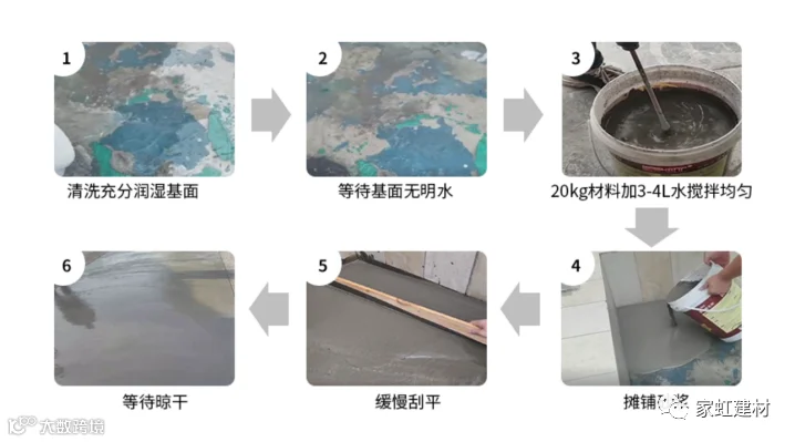 修补砂浆的施工工艺大致只需五步即可,分别是:1.地面清洗→2.等待晾干→3.加水搅拌→4.摊铺材料→5.等待凝固(2小时即可)。