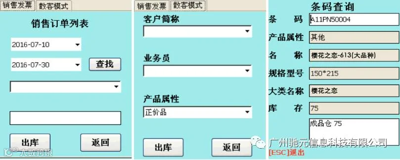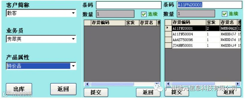 9、“散客模式”,用户选择完“客户简称”,一般都是“散客”,选择业务员,选择需要发货的产品属性,如图上,进入“出库”扫描界面,用户扫描需要发货的产品。