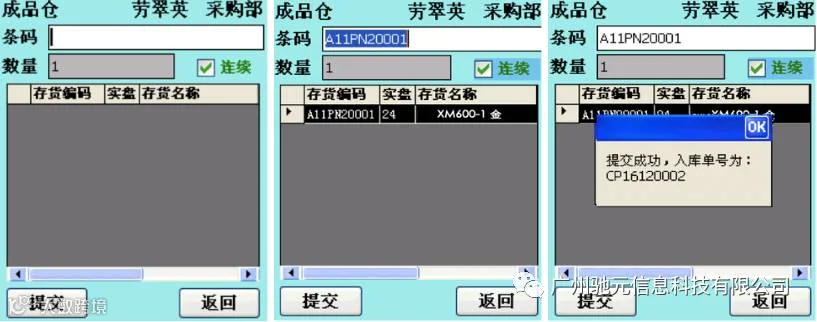 11、“实发”数量不能大于【存货】扫描完成后提交提示:【提交成功】