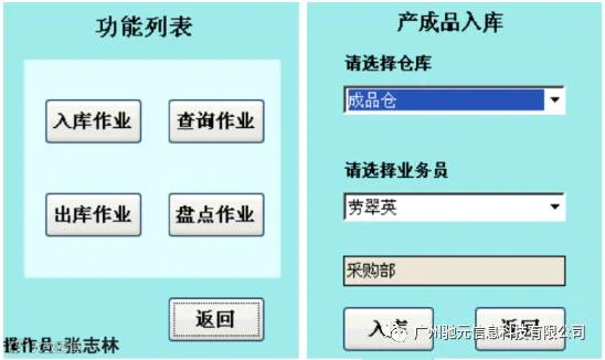 3、“入库作业”:选择入库仓库,一般都是成品仓,然后选择业务员,选择业务员会自动带出业务员所属部门,选择完成按“入库”