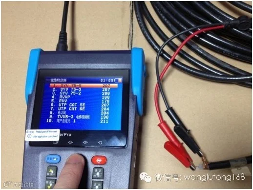 2.按设备第一行按键的”参数设置”键进入线型选择,按上下键选择对应的线型(如:75-2,75-3,75-5)等同轴线缆的线型,使用设备配备的 TDR 鳄鱼夹连接线(仅限带 TDR 测量的产品)一端夹住同轴线的铜芯,另外一端夹住同轴线的屏蔽层铜丝.