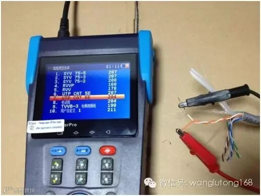2.按设备第一行按键的”参数设置”键进入线型选择,按上下键选择对应的线型( 如:UTPCAT 5E,UTP CAT 6E)等双绞线缆的线型,使用设备配备的 TDR 鳄鱼夹连接线 (仅限带 TDR 测量的产品)一端夹住双绞线的一端,另外一端夹住双绞线的另外一端.(注意:所夹线缆应该为成对的双绞线,如“白橙/橙”等任意一对双绞线都可以。要不然会导致测试不出来或者测试不准确的后果。)