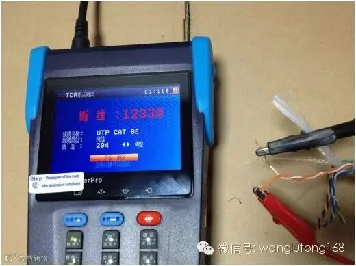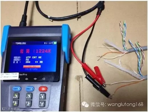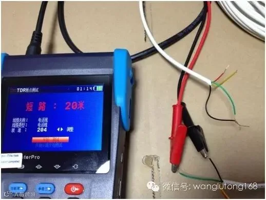 4.测试短路的时候直接把另外一端的两根铜丝绞在一起,就可以测试短路的距离。经试验验证短路的测试距离相当准确,同我们所准备的测试线缆的距离吻合。