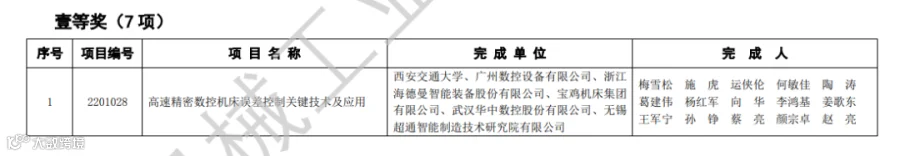 《高速精密数控机床误差控制关键技术及应用》项目由浙江海德曼智能装备股份有限公司与西安交通大学、广州数控设备有限公司、宝鸡机床集团有限公司、武汉华中数控股份有限公司、无锡超通智能制造技术研究院有限公司等共同申报。