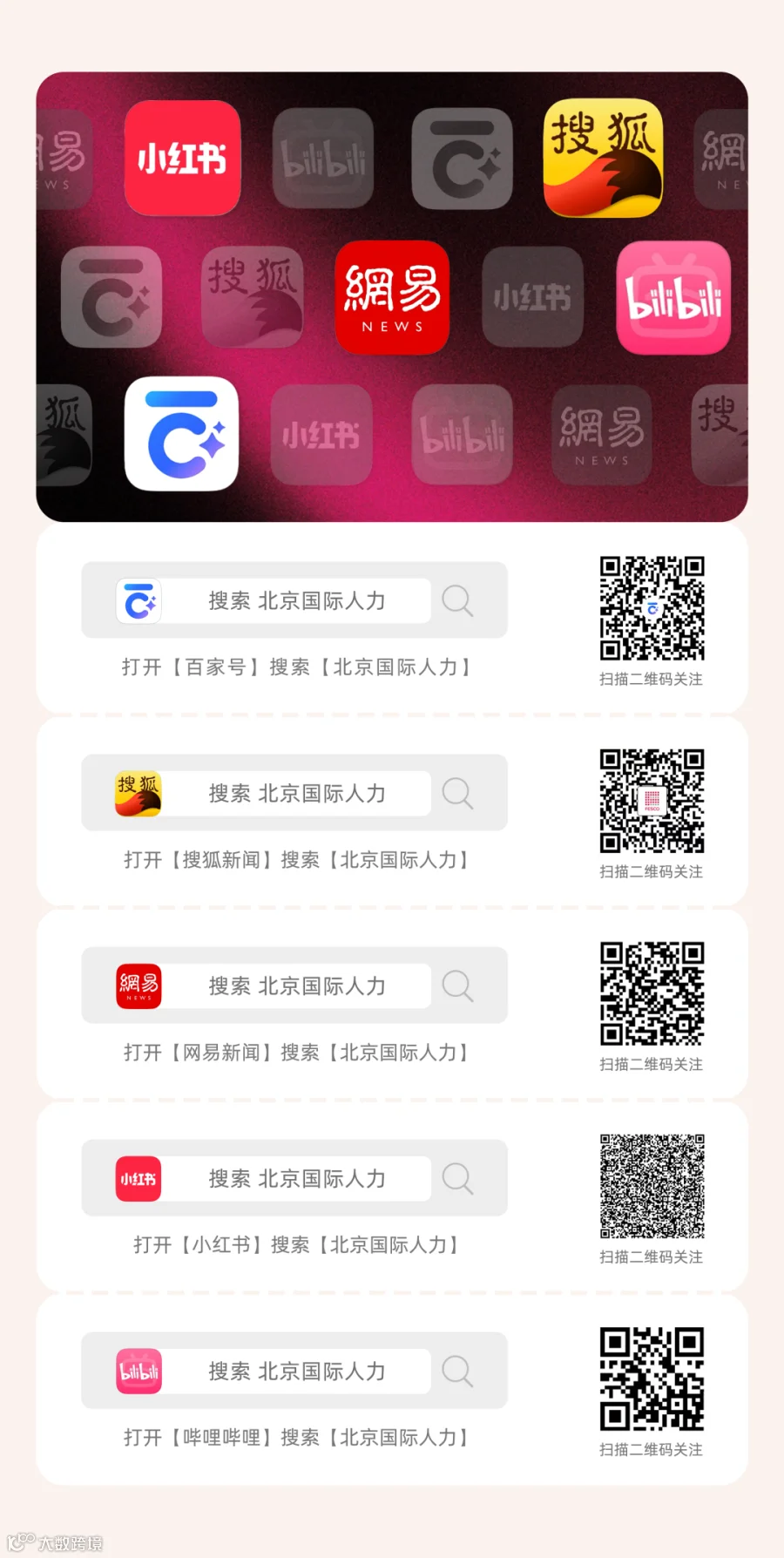 从网易的即时热点资讯,到bilibili的丰富知识分享;从小红书的多元展现形式,到搜狐的综合集合平台,再到的百家号的企业资讯呈现,无论你身处哪个平台,都能便捷获取北京国际人力带来的优质人力资源资讯,实现信息的无缝对接。