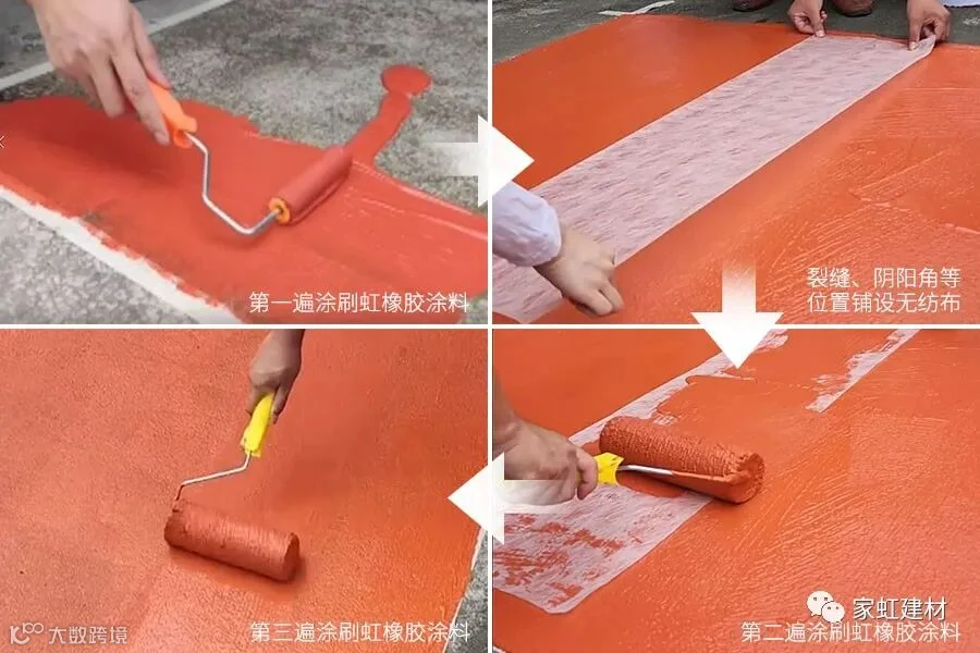 3、用滚子或刷子涂覆,根据选定的工法,按照打底层→下涂层→无纺布→中涂层→上涂层的次序逐层完成。