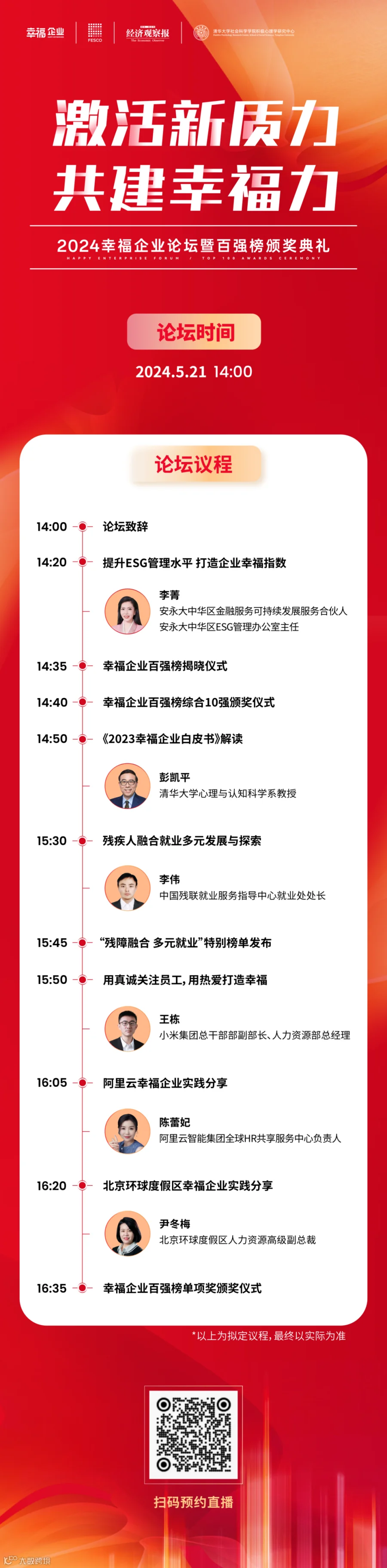 来自安永、阿里云、小米集团、北京环球度假区等行业领袖将齐聚一堂,分享他们如何将幸福理念融入企业文化和运营之中。这些成功企业的实践经验与见解,将为更多企业带来关于幸福企业建设的启发。