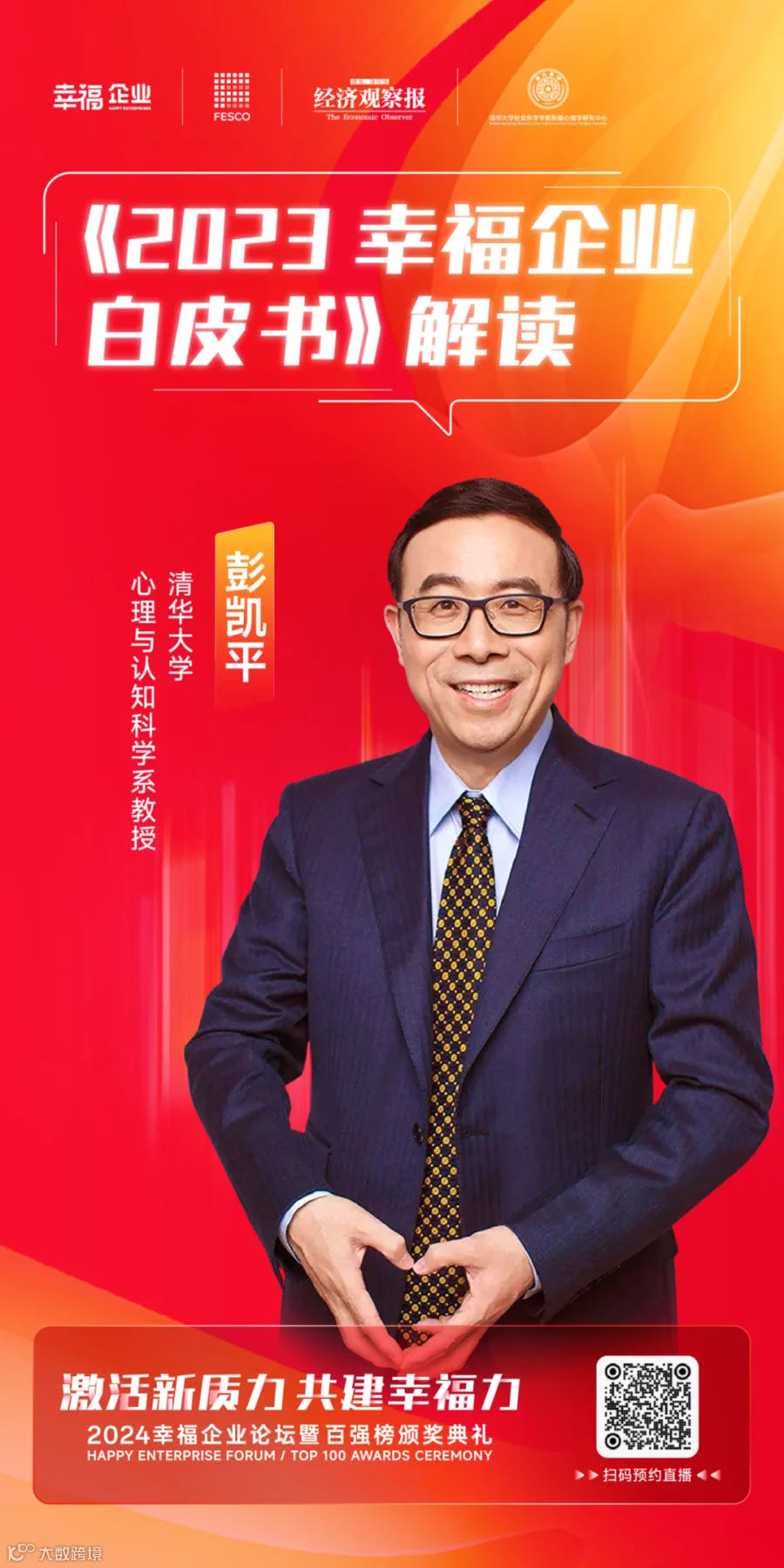 由FESCO与清华大学积极心理学研究中心共同发布的《2023幸福企业白皮书》从个人成长、团队关系、员工情感、企业实力、员工福利、工作体验等多角度深入剖析,为我们揭示构建幸福企业的深层逻辑。典礼现场,清华大学心理与认知科学系教授彭凯平将深入解读白皮书,全面诠释幸福企业核心要素。