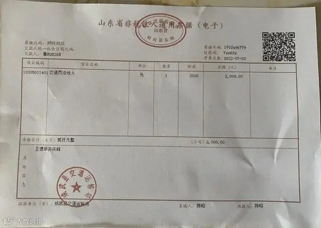 打印出来的票据显示,货车司机预交的款项为“交通罚没收入”,交款人为“车牌号”,收款单位“成武县交通运输局”,“其他信息”一栏中还注明了罚款经办人的名字。