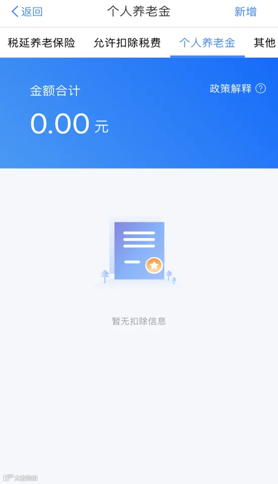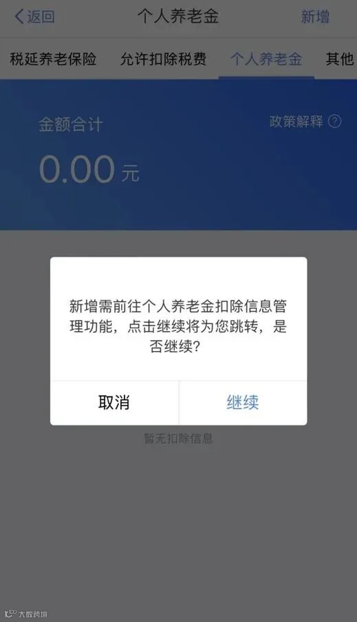 步骤1:在【费用、免税收入和税前扣除】-【其他扣除项目】下找到【个人养老金】,点击右上角【新增】,选择【继续】,跳转至【个人养老金扣除信息管理】模块。
