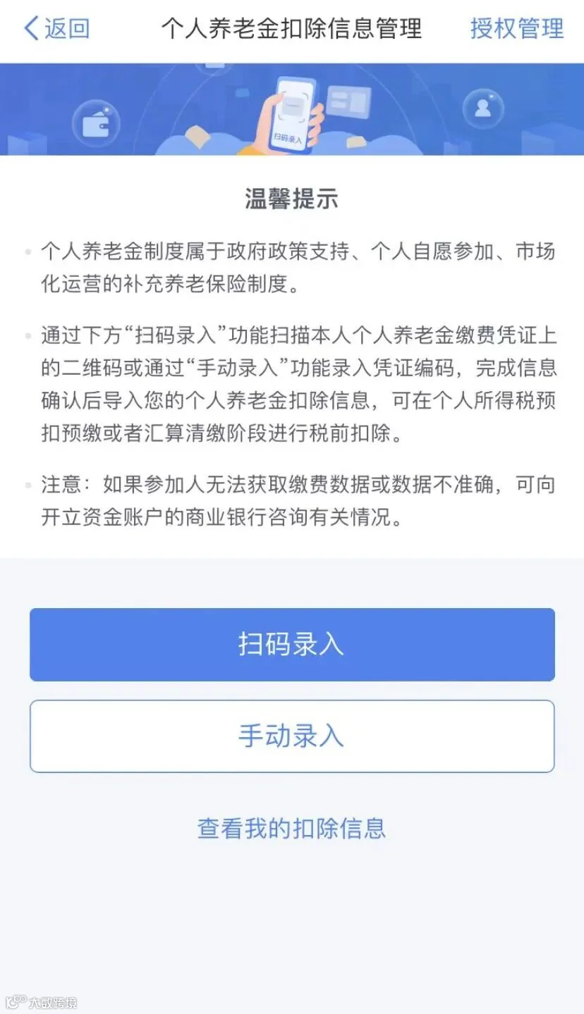 步骤2:选择【扫码录入】或【手动录入】的方式,将您的个人养老金数据代入系统中。