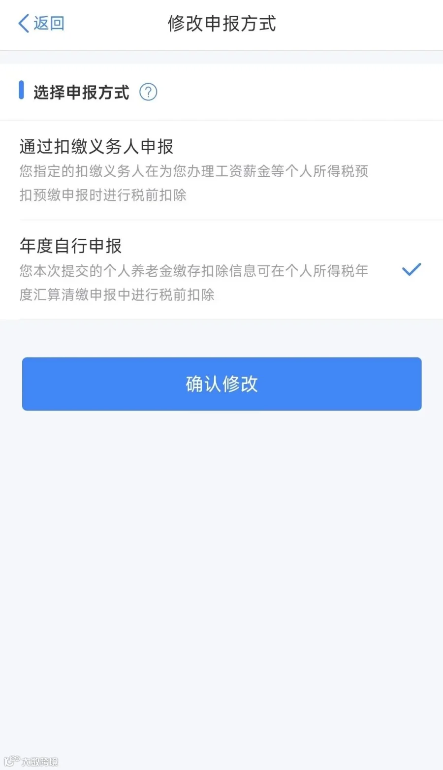 步骤3:申报方式选择【年度自行申报】后,点击【确认修改】。