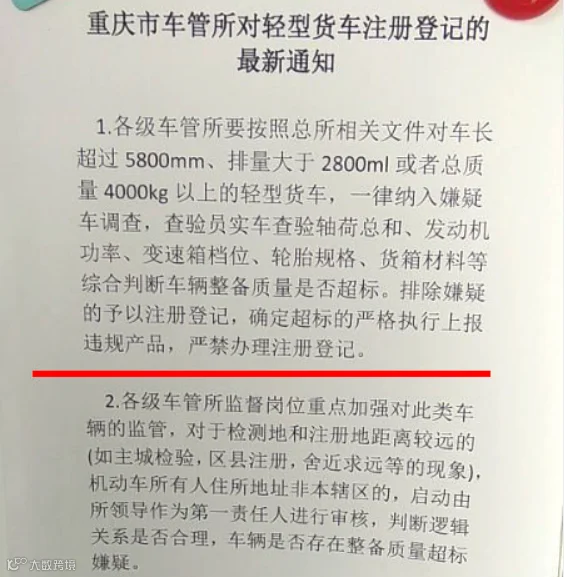 车管所发布一则《对轻型货车注册登记的最新通知》。通知中提到,各级车管所按照总所相关文件对车长超过5800mm,排量大于2800ml或总质量4000kg以上的轻型货车,一律纳入嫌疑车调查。