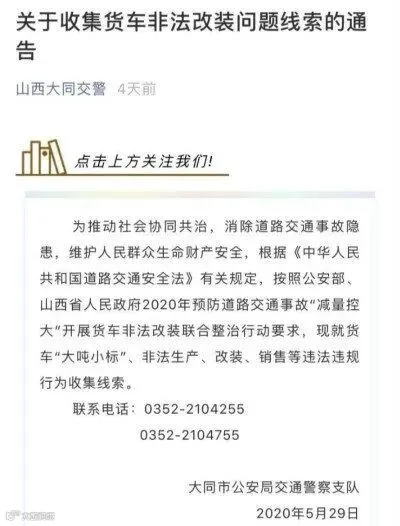 市公安局交通警察支队发布通告表示:要收集货车“大吨小标”、非法改装问题线索,联系电话:0352-2104255、0352-2104755。在收集完线索后,山西大同下一步大概率就会着手重点治理了。