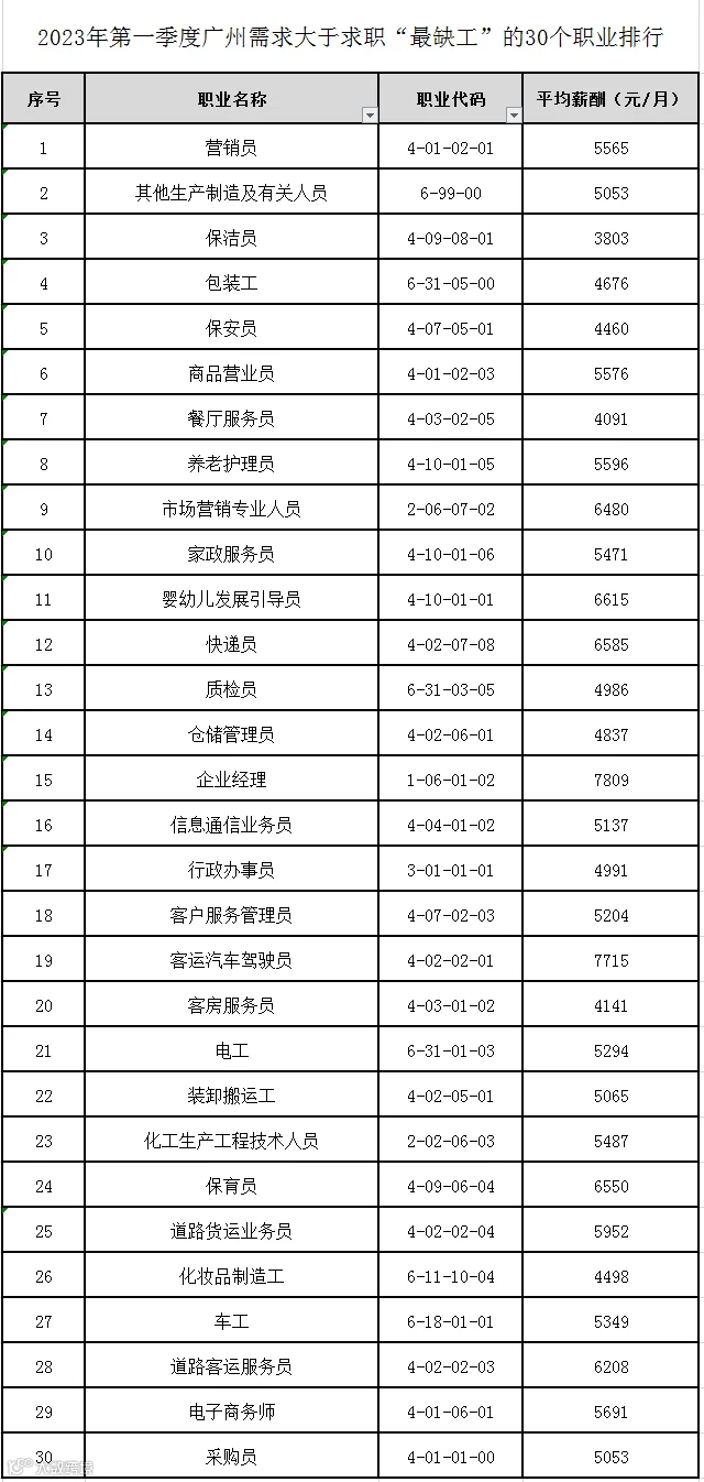 该排行来源于广州市、区公共就业服务机构登记的公共人力资源市场招聘、求职数据。剔除无效数据后,综合考量岗位缺口数量、求人倍率等因素汇总整理形成,按“需求人数”与“求职人数”岗位缺口数量从大到小排列,取前30个职业,形成排行。