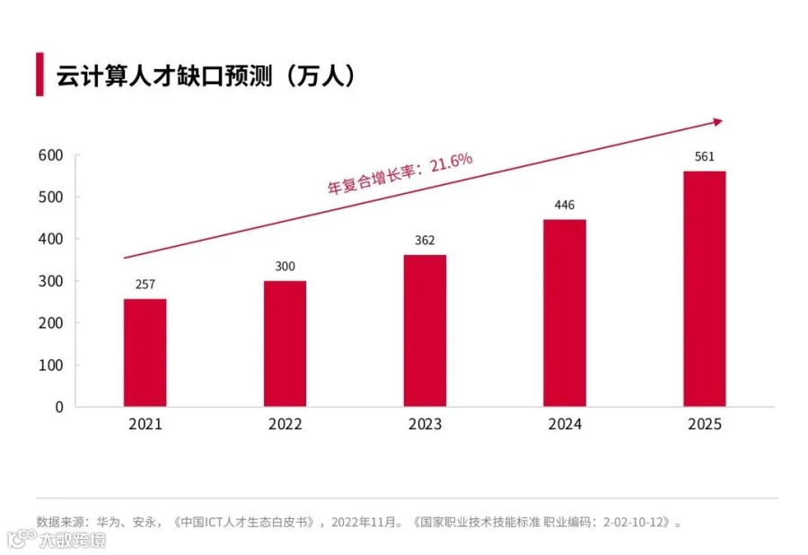 人社部发布的《新职业——云计算工程技术人员就业景气现状分析报告》指出,“统计数据显示,2018年,国内云计算人才在互联网岗位占比不到5%,而在未来5年,我国云计算产业面临高达150万人的人才需求。如今,我们已经迈入产业互联网时代,各行各业都开始积极‘上云’,云计算等相关人才需求与日俱增。”
