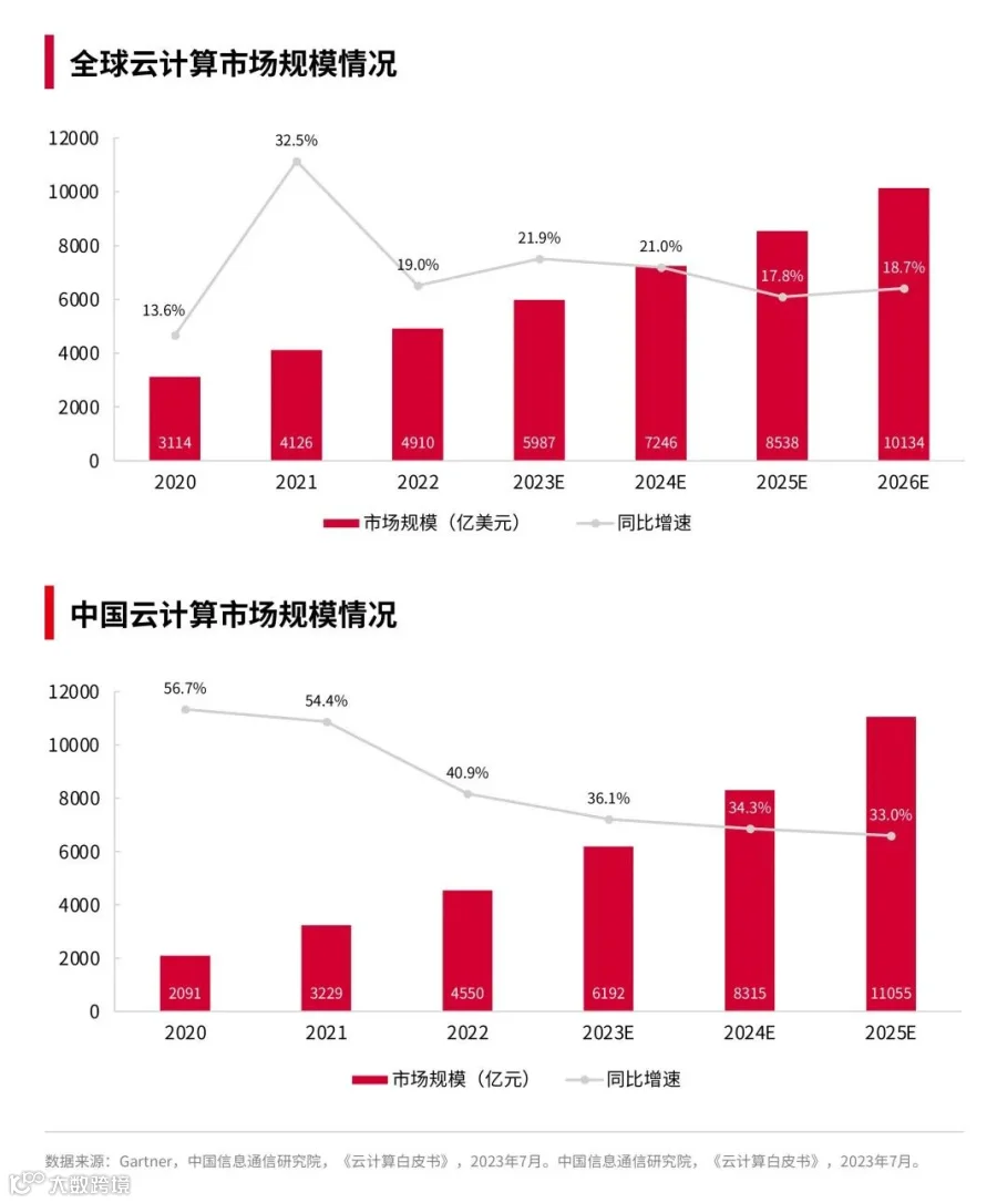 我国云计算市场规模增速一直领先于全球云计算市场规模增速,中国信息通信研究院预测数据显示,2023年预计我国云计算市场规模为6192亿元,同比增速为36.1%,未来两年我国整体云计算市场规模增速将有所下降。