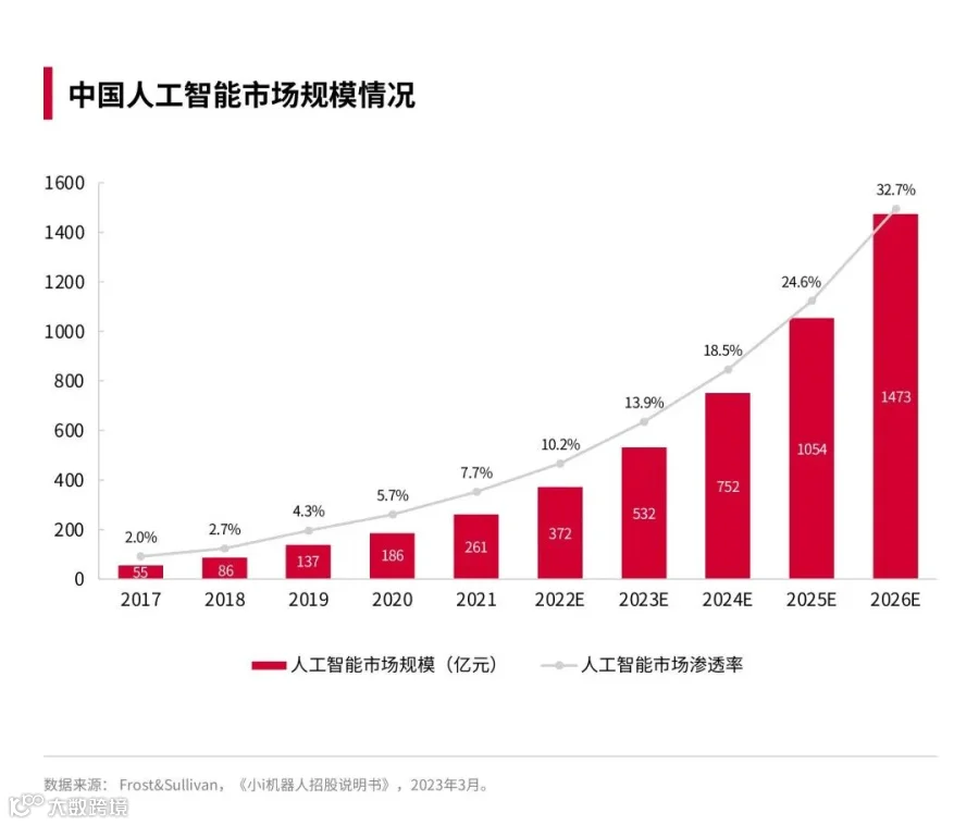 Frost&Sullivan预测数据显示,2023年中国人工智能市场规模为532亿元,人工智能市场渗透率为5.7%;预计2024-2026年,我国人工智能市场规模复合年增长率为39.99%。