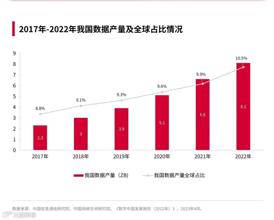 2022年我国数据产量达8.1ZB,同比增长22.7%,占全球数据总产量的10.5%,位居世界第二。随着我国数据资源供给能力持续提升,我国数据资源流通利用发展能力也在持续增强。