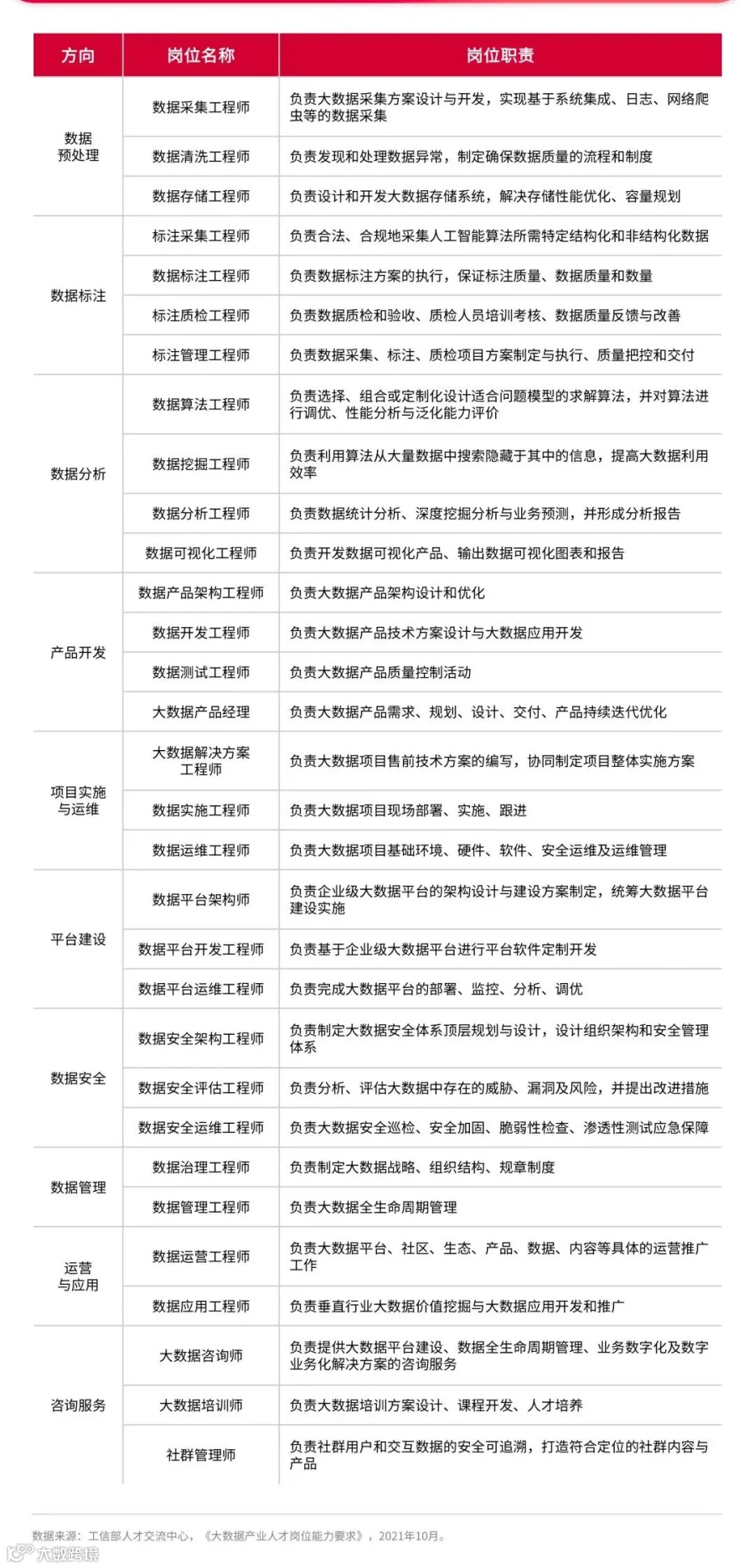 同时,大数据工程技术人才在不同细分领域中呈现的岗位类型与职责也存在差异。