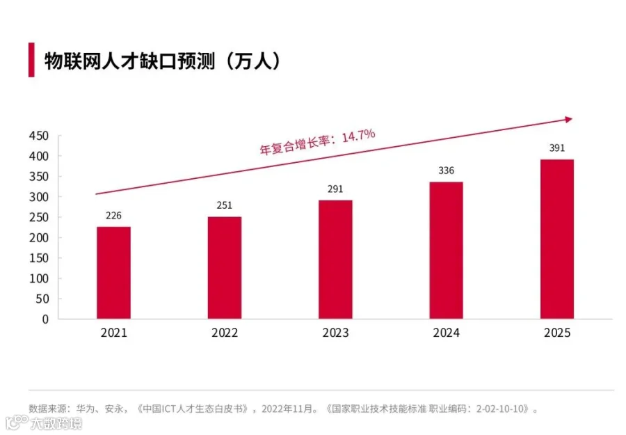 人社部发布的《新职业——物联网工程技术员就业景气现状分析报告》指出,“目前许多本科及职业院校已开设了物联网相关专业,并加大专业建设投入,提升人才培养的质量。同时,市场对这方面人才的需求量越来越大。有调查显示,未来五年,物联网行业人才需求缺口总量超过1600万人,物联网工程技术人员将拥有非常广阔的职业发展空间。”