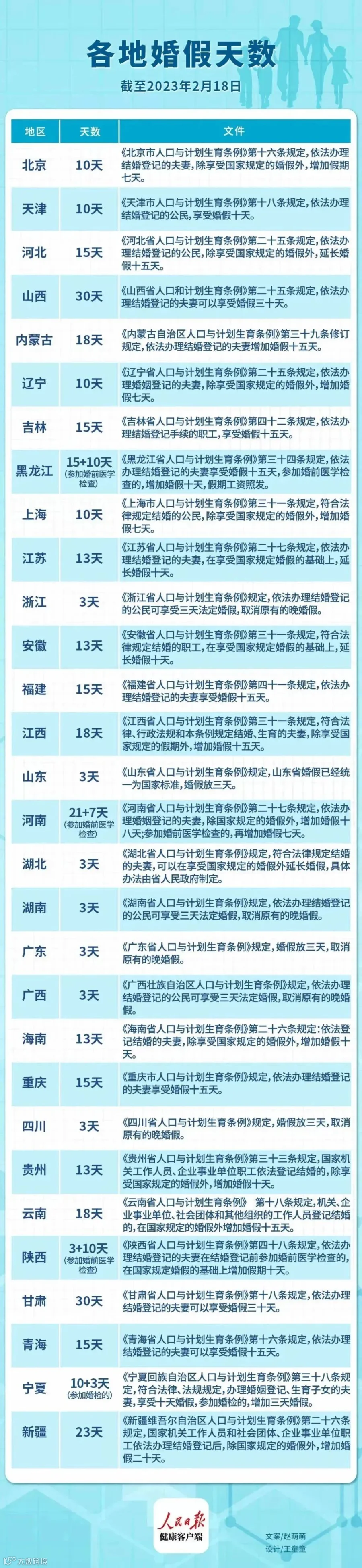 此外,黑龙江、河南、陕西、宁夏等地还增加了对于参加婚前医学检查的夫妻,增加婚假的规定,河南最长可达28天。