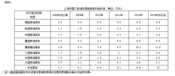 从2019年10月1日起施行的《上海市鼓励国三柴油车提前报废补贴实施办法》中,我们了解到微型柴油货车最高补贴金额为0.9万元;轻型柴油货车最高补贴金额为3.5万元;中型柴油货车最高补贴3.9万元;重型柴油货车最高补贴6.8万元;集装箱运输车最高可补贴11.6万元。