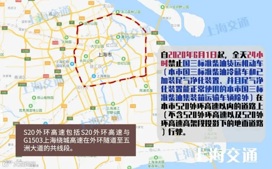 自2020年8月1日起,上海市国三标准柴油冷藏车和按要求已加装尾气净化装置、并且尾气净化装置正常使用的本市国三标准柴油集装箱运输车辆,全天24小时禁止在本市S20外环高速以内的道路上(不含S20外环高速以及S20外环高速高架段投影下的地面道路)行驶。