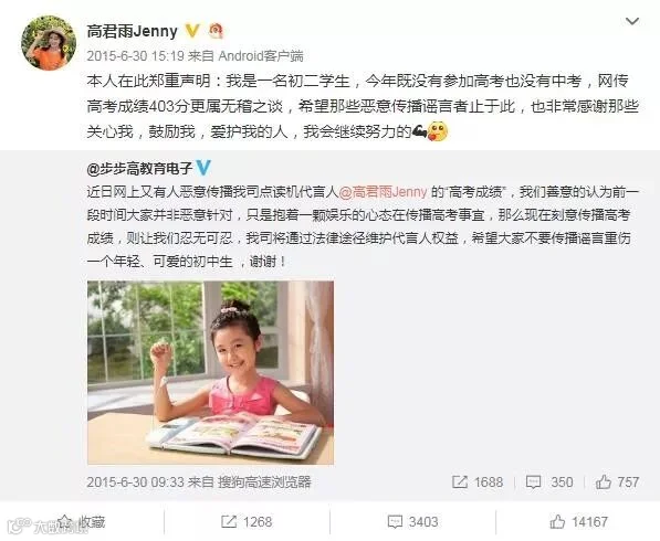 2015年6月30日,有网友造谣“点读机女孩今年高考成绩出来了,成绩才403,连本科线都没有上,让你天天so easy。”该微博立刻引起了广大网友的关注。随后高君雨当天下午就在个人微博上辟谣称:自己还是一个初二的学生,根本还没到参加高考的时候,网传高考成绩403分更属无稽之谈。