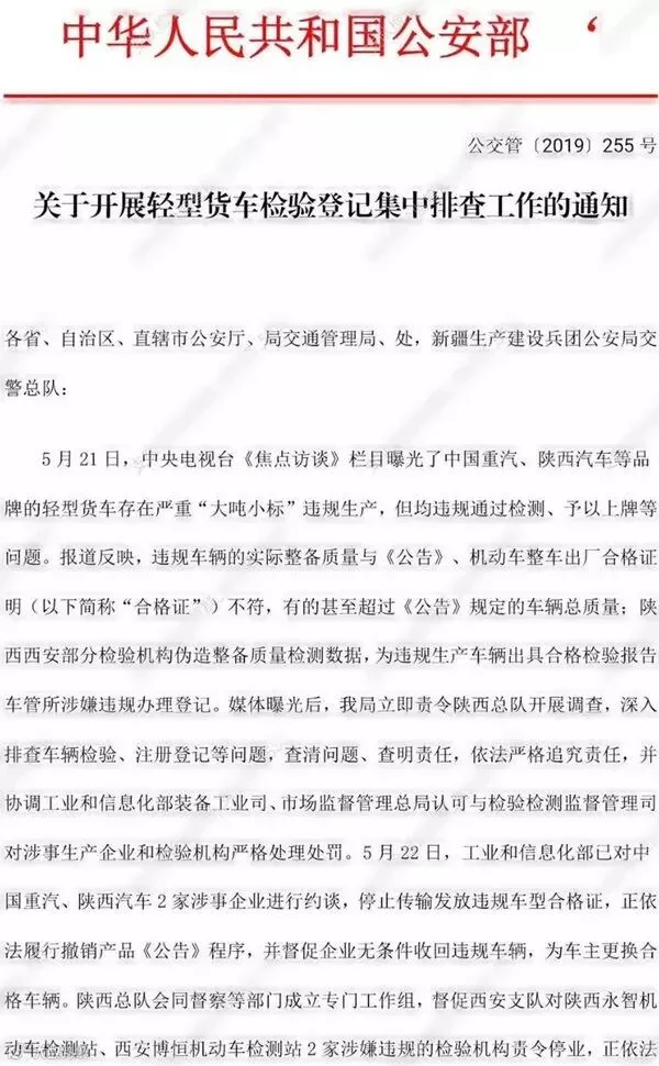 据了解,从5月22日起,交管局就发布了《关于开展轻型货车检验登记集中排查工作的通知》,要求在8月底前,各地要立即组织对2019年1月1日之后办理轻型载货汽车注册登记情况进行一次集中排查。