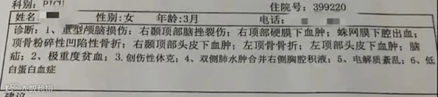看到医生出的诊断书时,真的是让人心疼不已:重型颅脑损伤,顶部脑挫裂伤,顶骨粉碎性凹陷性骨折,创伤性休克,极重度贫血。