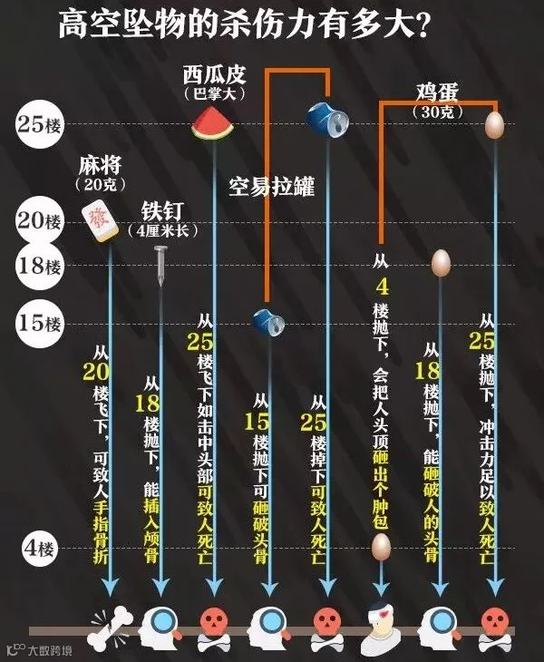 高空坠物的伤害力,是超乎每个人想象的,大家可以看看示意图,感受一下60克的鸡蛋就可以毁掉别人宝贵的生命是一种怎样的感觉。