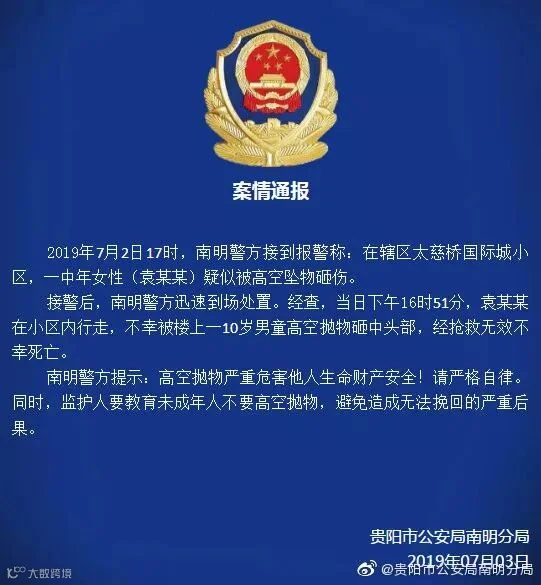 7月2日,一中年女性被高空坠物砸伤后,经抢救无效,不幸死亡,而这个夺取他人性命的行为,同样是一个孩子所为。