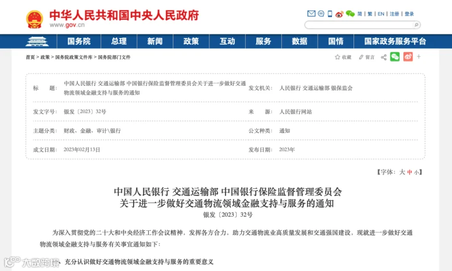 为深入贯彻党的二十大和中央经济工作会议精神,近日,人民银行、交通运输部、银保监会联合印发《关于进一步做好交通物流领域金融支持与服务的通知》(以下简称《通知》),助力交通物流业高质量发展和交通强国建设。