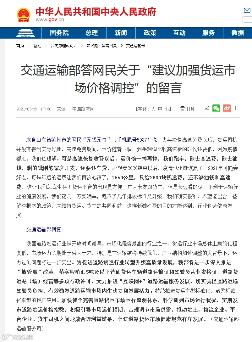 导读:交通运输部5月20日回复了一位来自山东省滨州市的网民关于“建议加强货运市场价格调控”的留言。来自山东省滨州市