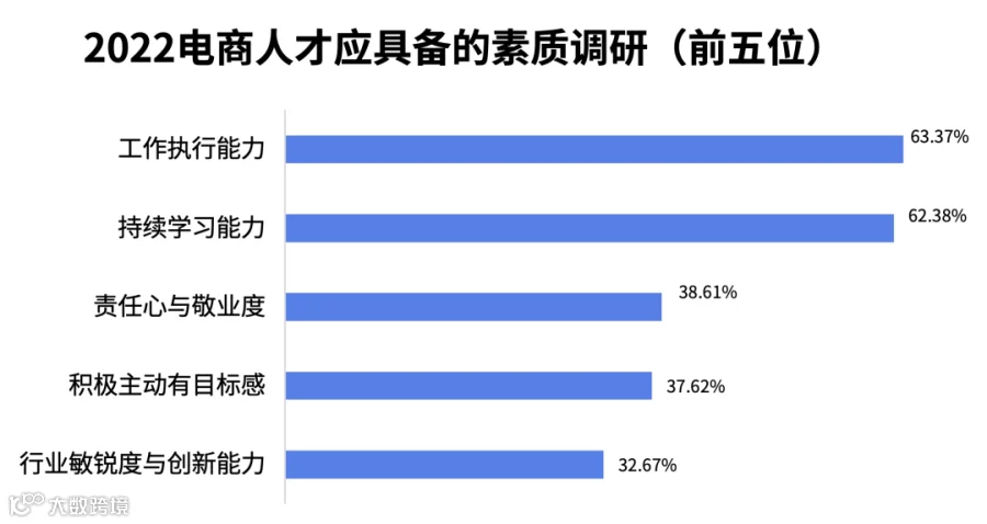 根据网经社电子商务研究中心对400家样本电商企业的调研发现,被调查企业中,39.6%的企业急需电商平台传统运营人才,36.63%的企业急需新媒体、内容创作、社群方向人才,43.56%的企业急需主播(助理)、网红达人方向人才,24.75%的企业需要数据分析与运营分析人才,18.81%的企业需要客服、地推、销售人才。与此同时,被调查企业中,新晋求职者如果想快速被电商企业接受,工作执行能力、持续学习能力、和责任心敬业度排前三名,也说明了电商企业对刚毕业大学生的核心要求。